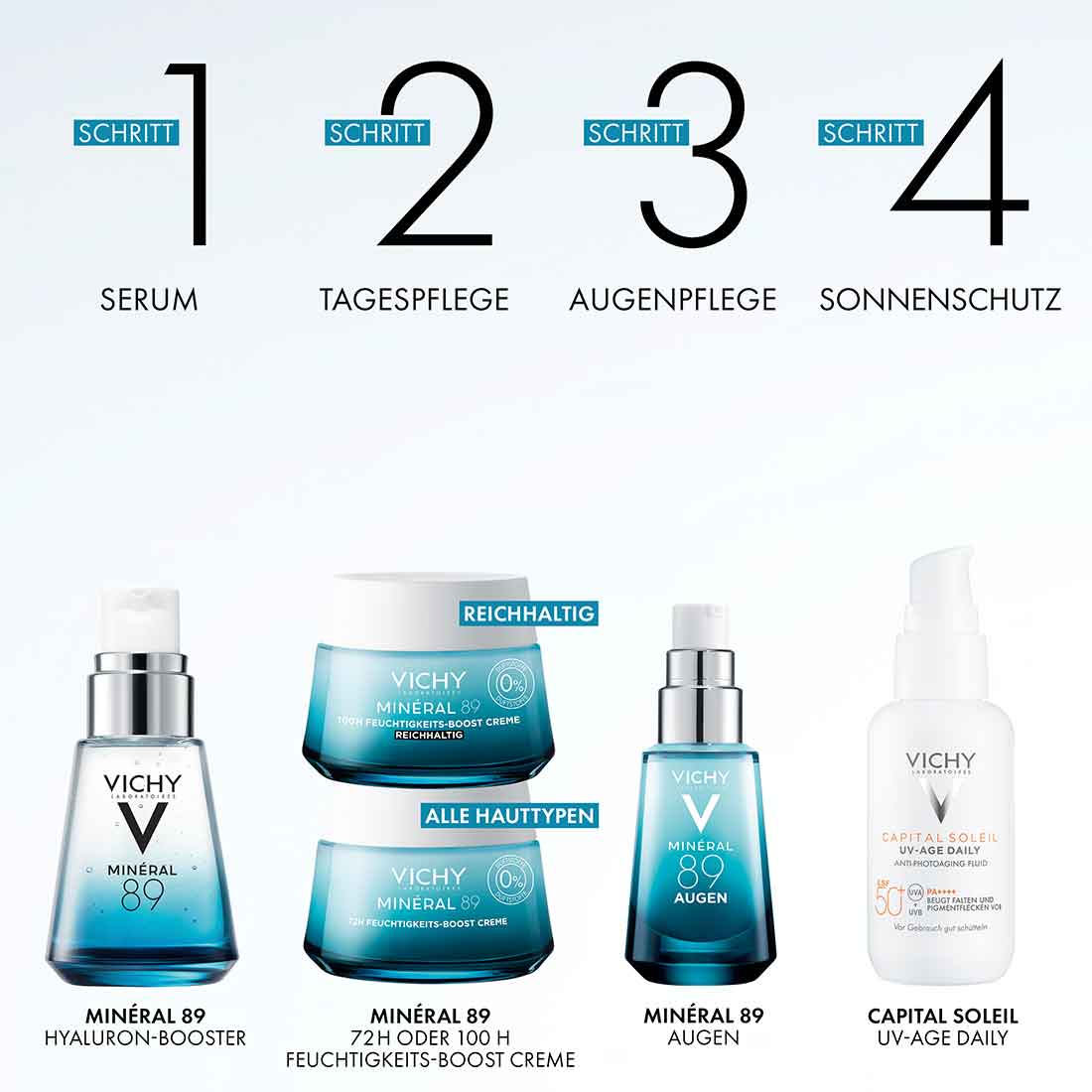 Entnimm eine kleine Menge des Vichy MINÉRAL 89 Hyaluron-Boost Serums und trage es morgens und abends auf die gereinigte Haut auf. Verteile es gleichmässig auf Gesicht und Hals.