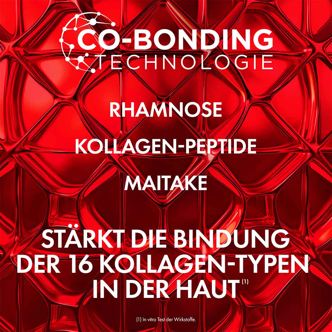 Der Wirkstoffkomplex aus Rhamnose, Kollagen-Peptiden und Maitake bekämpft 16 sichtbare Zeichen der Hautalterung: Falten, feine Linien, Straffheit, Aufpolsterung, Volumenverlust, geglättete Haut, verfeinerte Textur, definierte Konturen, Hautdichte, Stärkung der Hautschutzbarriere, minimierte Poren, Ausstrahlung, Geschmeidigkeit, Elastizität, Feuchtigkeit und Ebenmässigkeit.