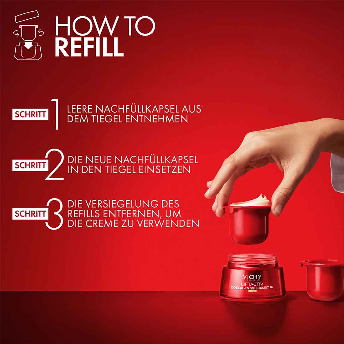 Das innovative Refill-System ist leicht anzuwenden und schont die Umwelt durch weniger Verpackungsmaterial. Gönn deiner Haut den Schutz und die Pflege, die sie verdient – mit dem LIFTACTIV Collagen Specialist 16 LSF 50 Refill.
