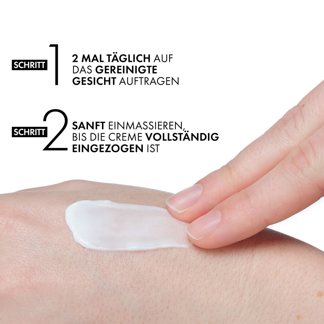 Die Creme sanft mit den Fingerspitzen einmassieren, bis sie vollständig eingezogen ist und die Haut optimal mit Feuchtigkeit versorgt.