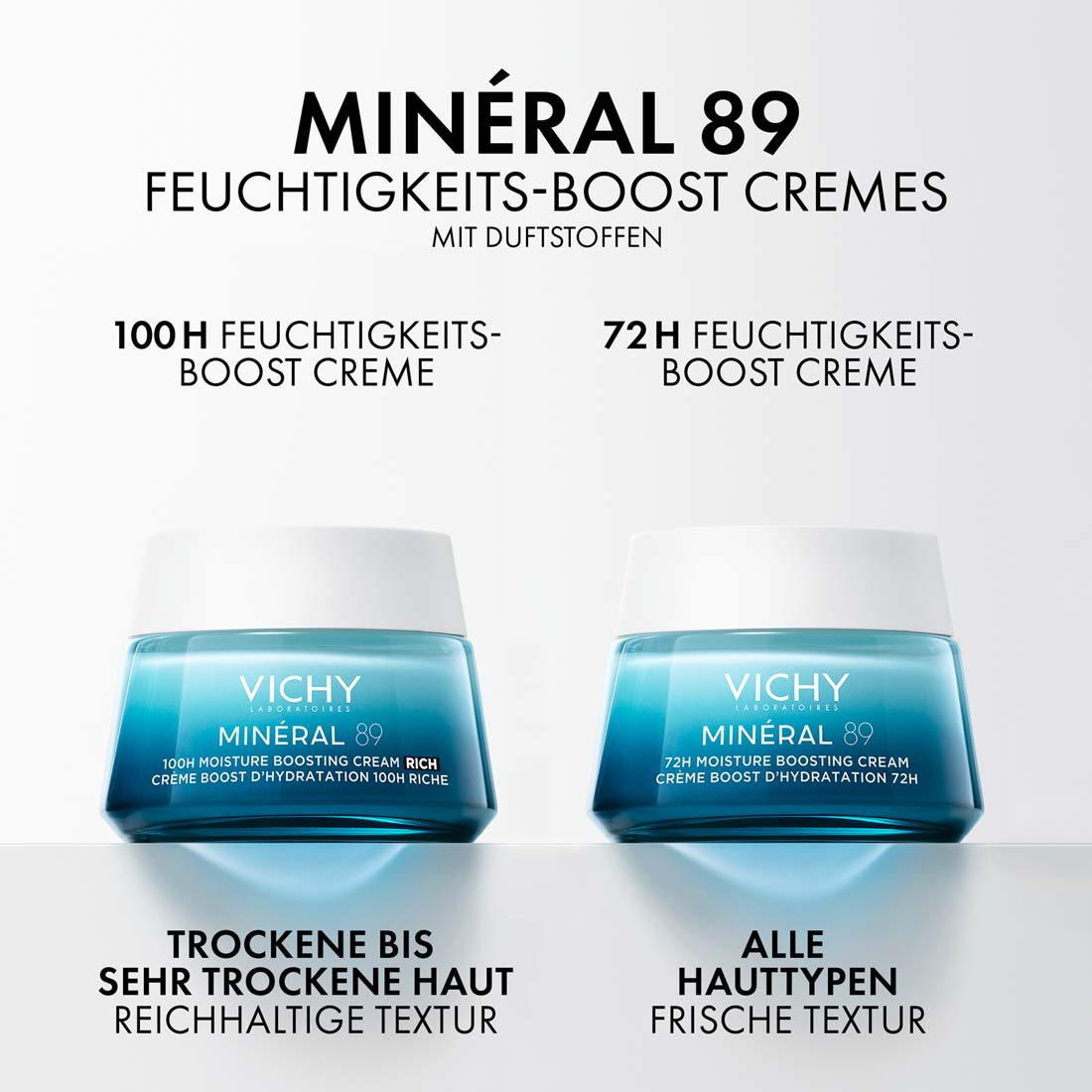 Morgens und abends nach der Reinigung zuerst das MINÉRAL 89 Hyaluron-Boost Serum auftragen. Danach eine dünne Schicht der MINÉRAL 89 100H Feuchtigkeits-Boost Creme mit Duft auf Gesicht und Hals verteilen, dabei die Augenpartie aussparen.