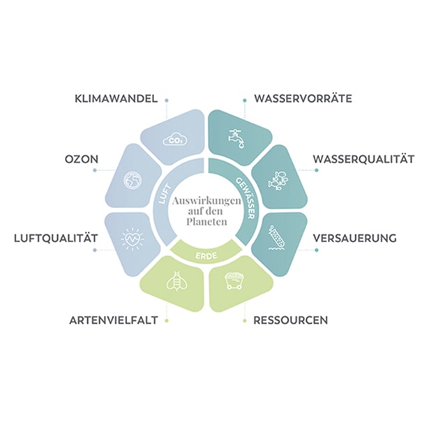 Die verschiedenen Auswirkungen auf den Planeten – wie Klima, Wasser und biologische Vielfalt – werden für jede Lebensphase des Produkts berechnet und kombiniert. Dieser Ansatz wird in der Wissenschaft am häufigsten zur Messung der Umweltauswirkungen eines Produktes verwendet.