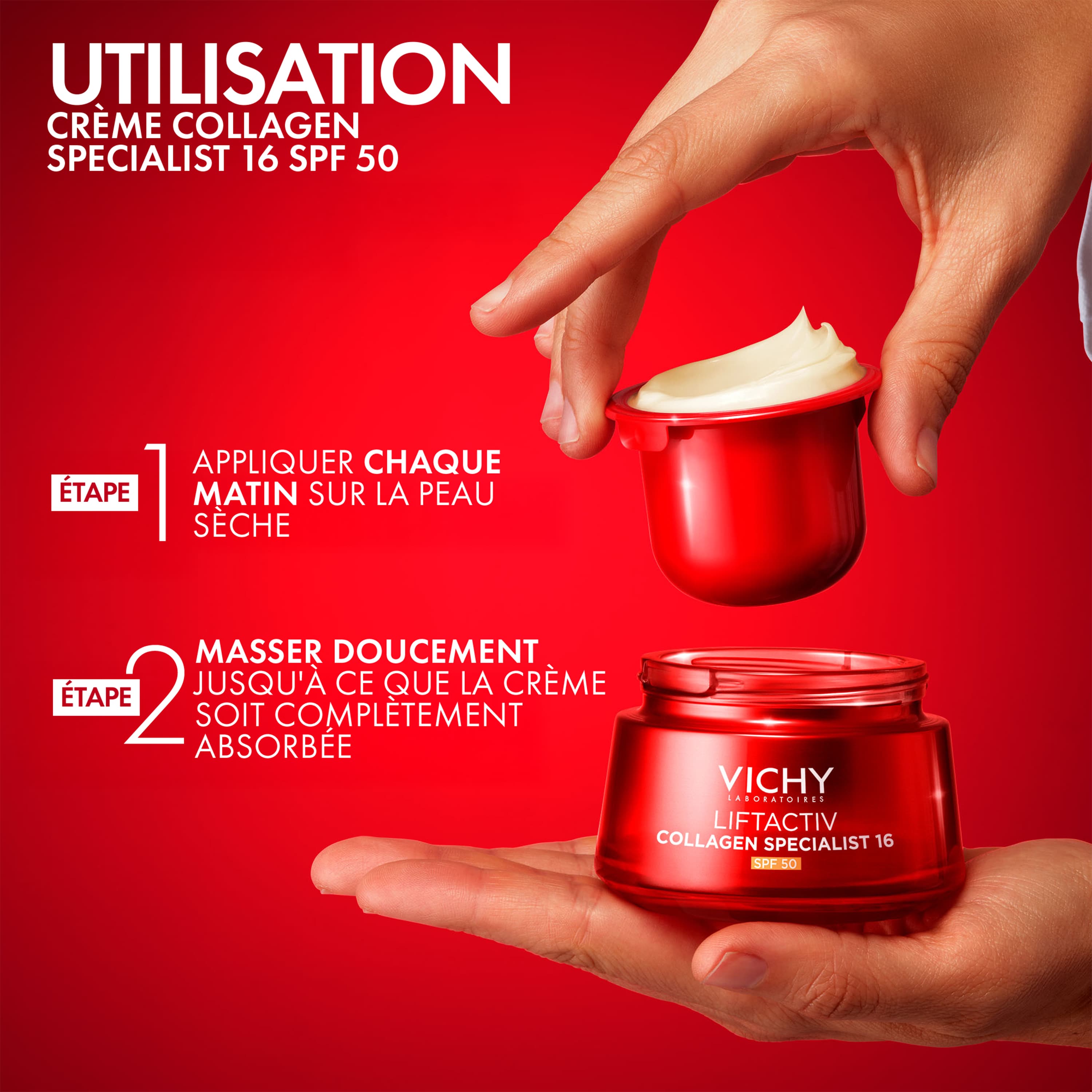 Appliquez maintenant la crème de jour Collagen Specialist 16 SPF 50 de manière uniforme sur le visage, le cou et le décolleté. Massez avec le bout des doigts pour faire pénétrer.